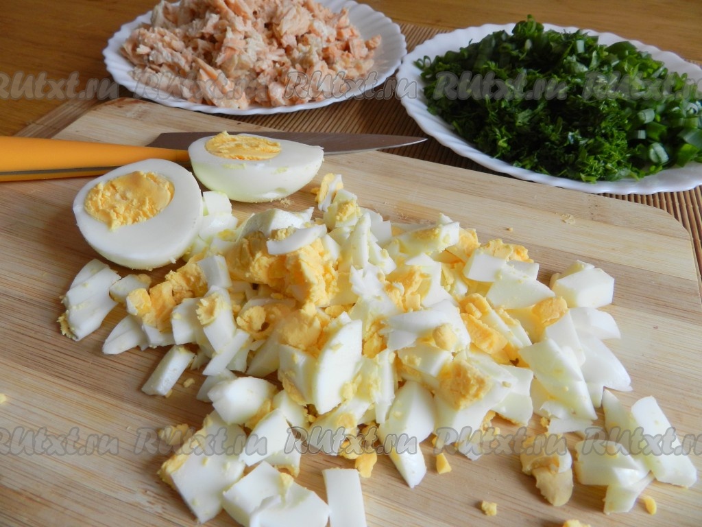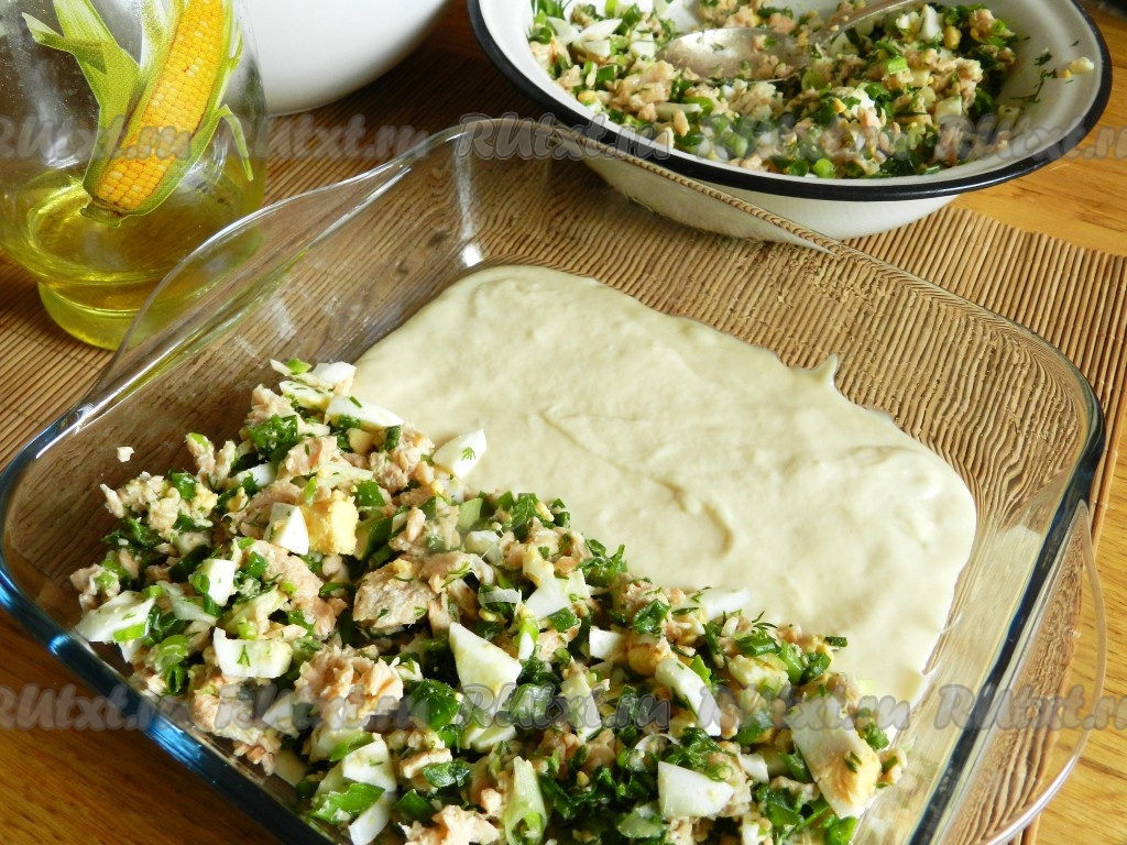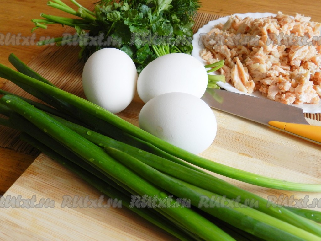 Смешать для начинки яйца, зелень и рыбу. По вкусу посолить и поперчить начинку.