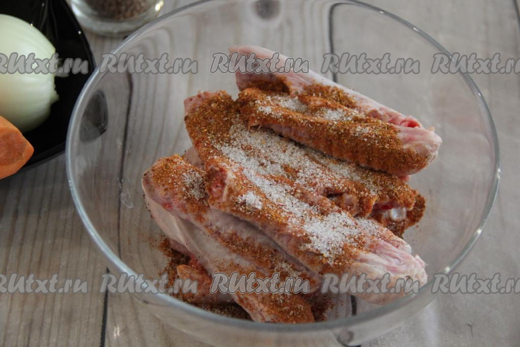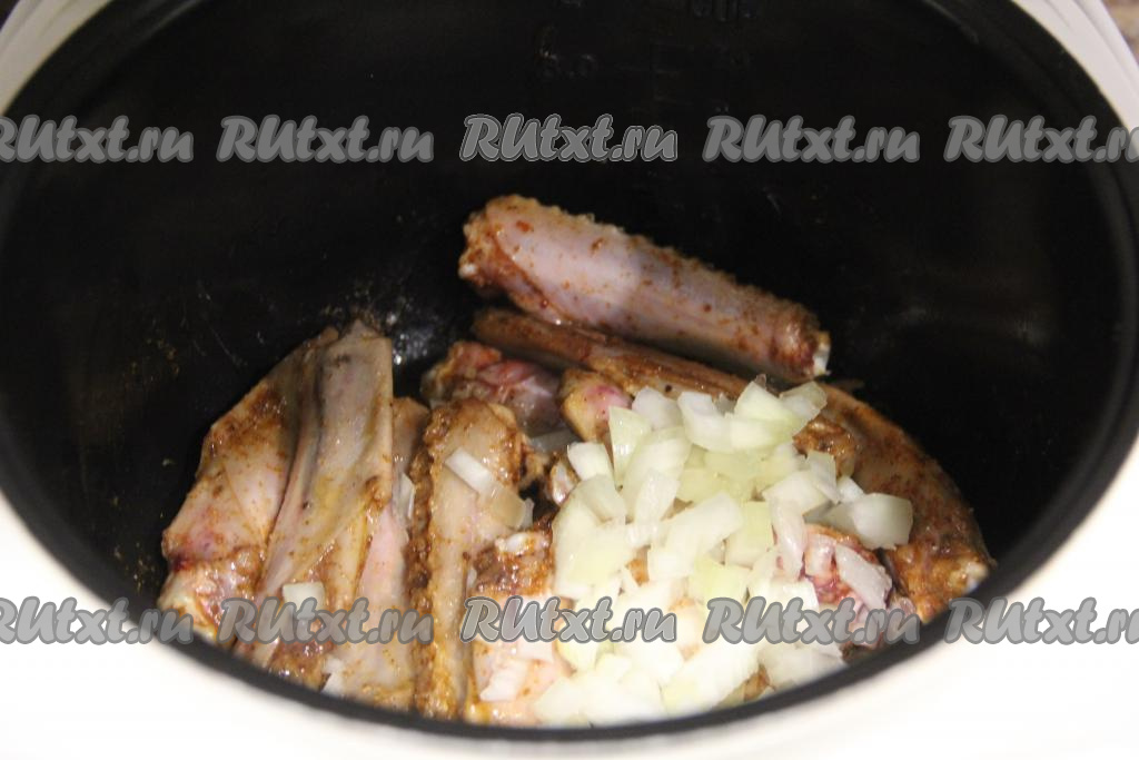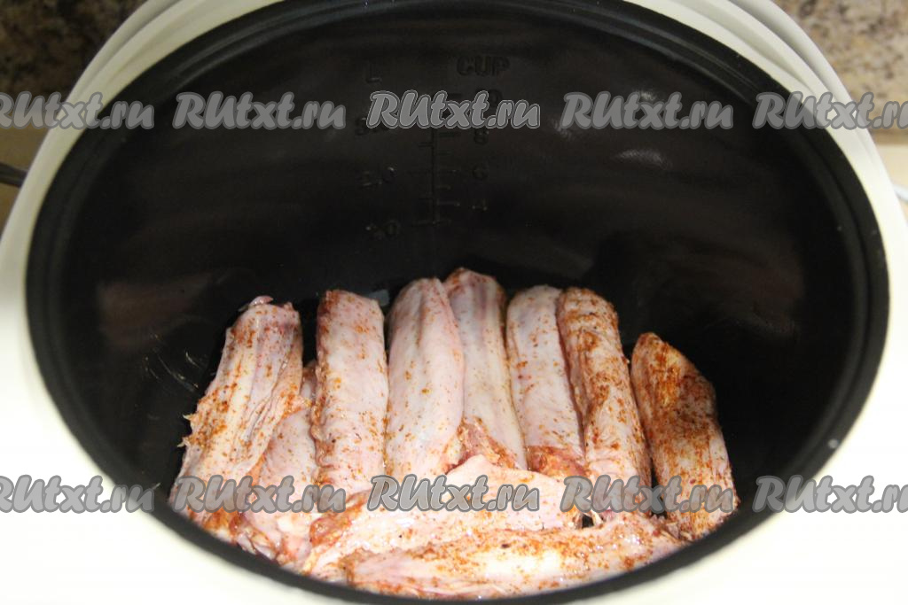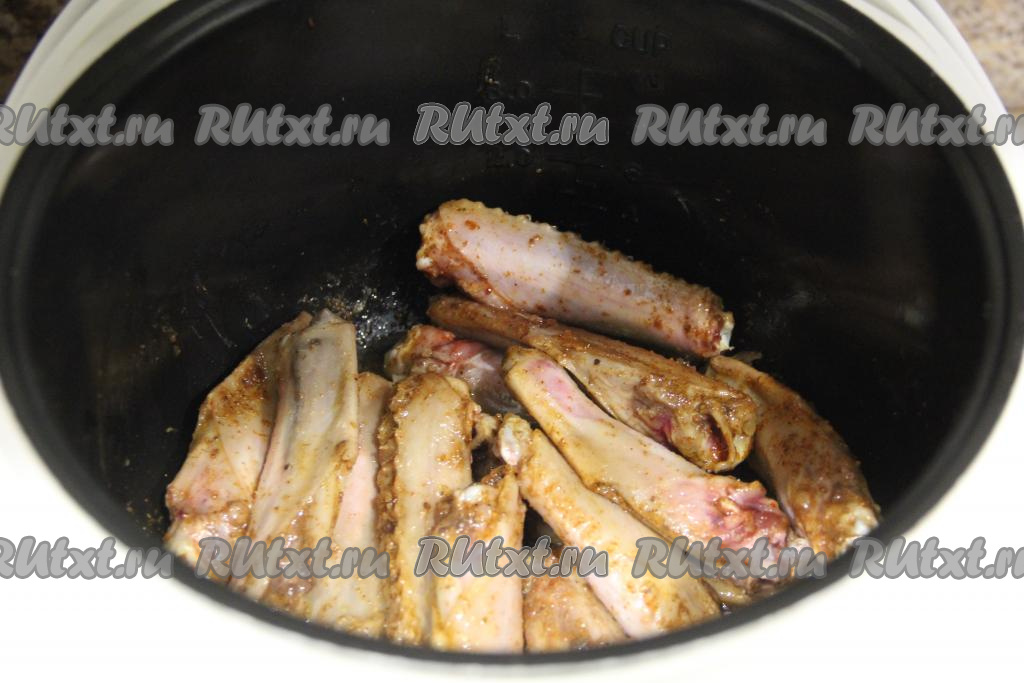 В чашу мультиварки влить растительное масло, затем выложить утиные крылья, стараясь располагать их в один слой.