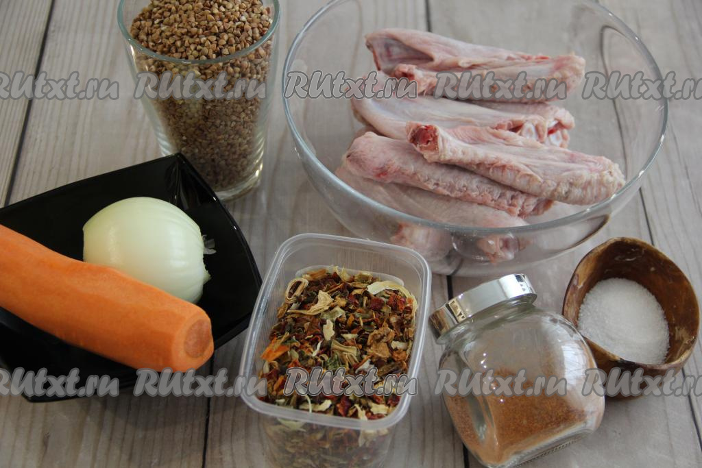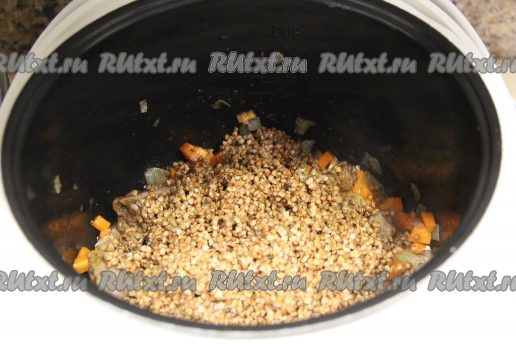 Хорошо промыть гречку, убирая чёрные зёрнышки. Подготовленную гречневую крупу всыпать в чашу мультиварки к овощам и утиным крыльям.