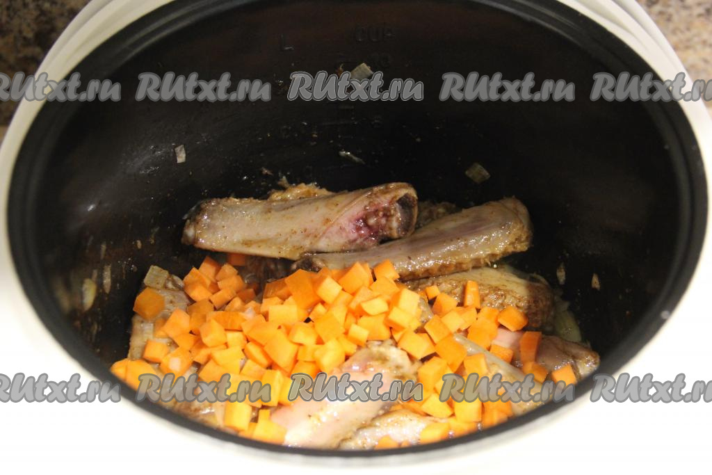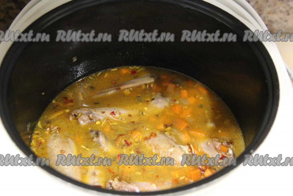 Влить воду комнатной температуры и перемешать. Закрыть крышку мультиварки, выставить режим "Плов" на 35 минут.