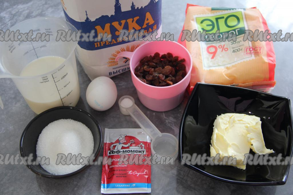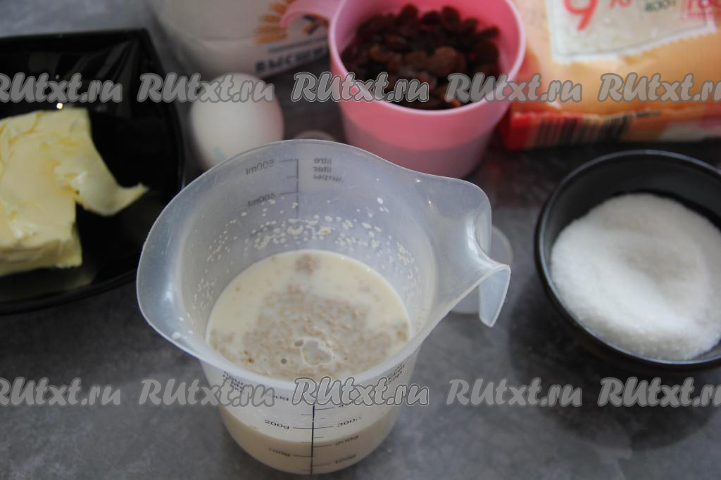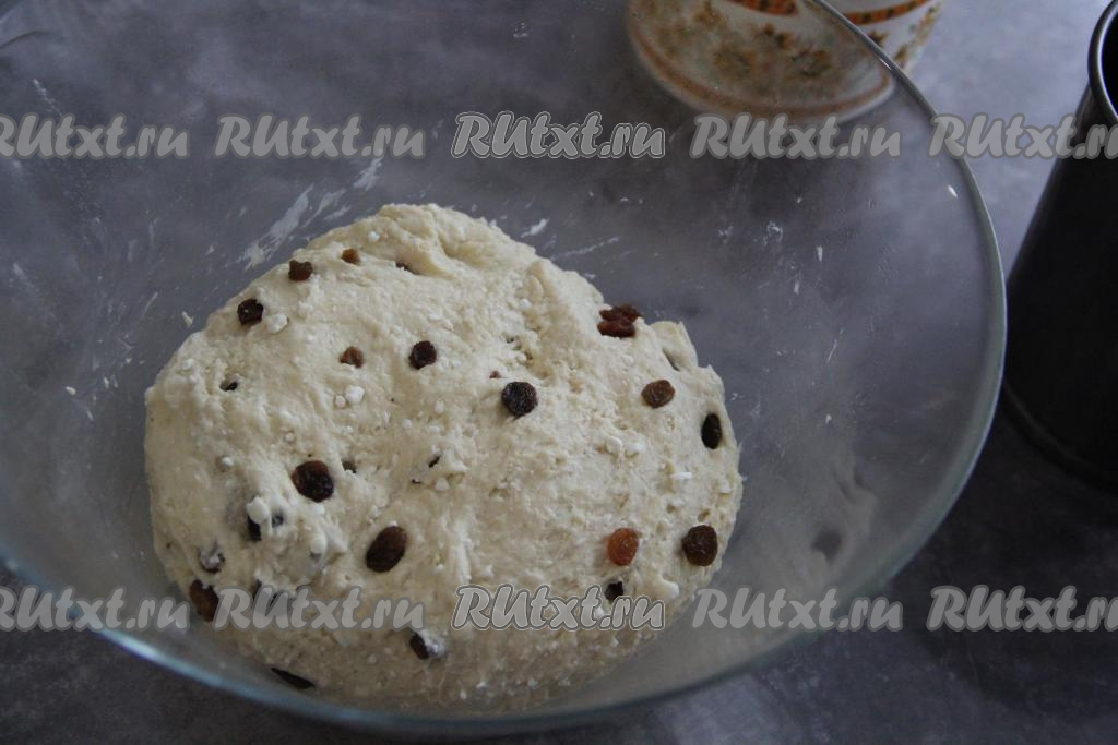 Добавить в тесто изюм и хорошо вмешать его руками в тесто. Чтобы изюм был более нежным в выпечке, его можно предварительно запарить в кипятке (то есть залить кипятком на 5 минут, а затем воду слить и обсушить изюм на полотенце).