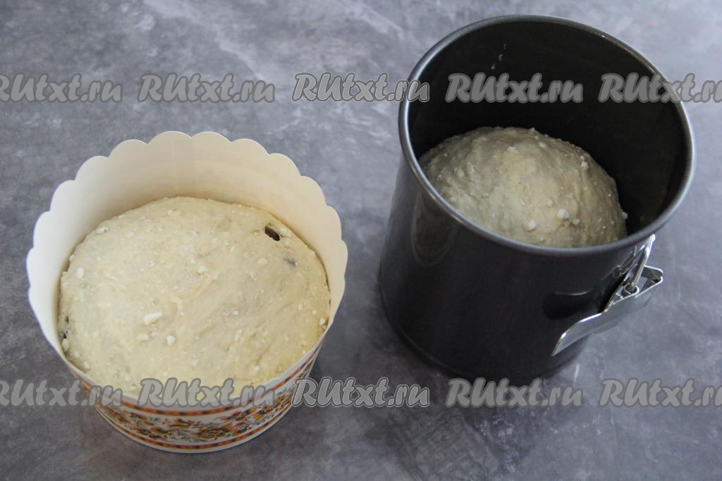 Тесто разделить на части и выложить в формы для куличей, заполняя их на половину объёма (у меня получилось 2 кулича). Оставить формы с тестом на 1 час в тёплом месте, накрыв полотенцем.
