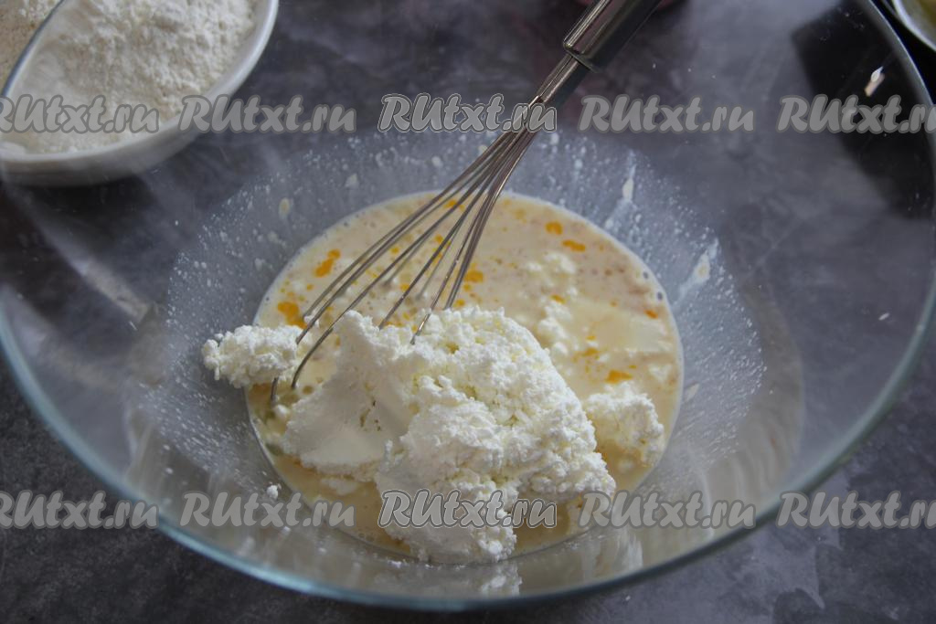 Добавить в миску творог. Если не любите крупинки в тесте, то предварительно пробейте творог погружным блендером или перетрите через сито. Перемешать массу венчиком.