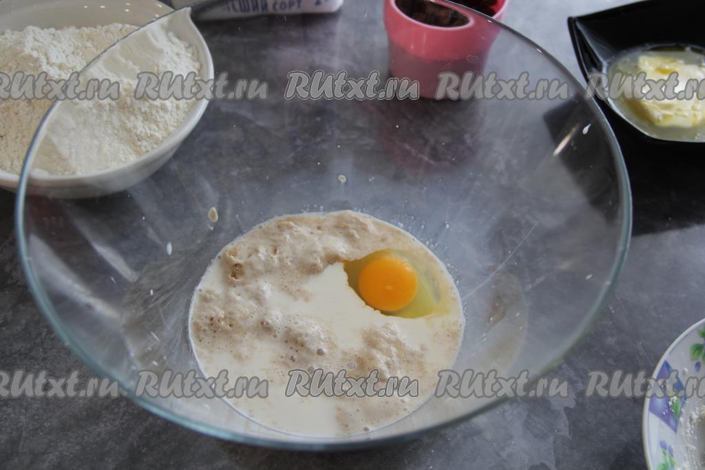 Запенившуюся опару влить в глубокую миску, добавить оставшийся сахар, яйцо и соль, перемешать венчиком.