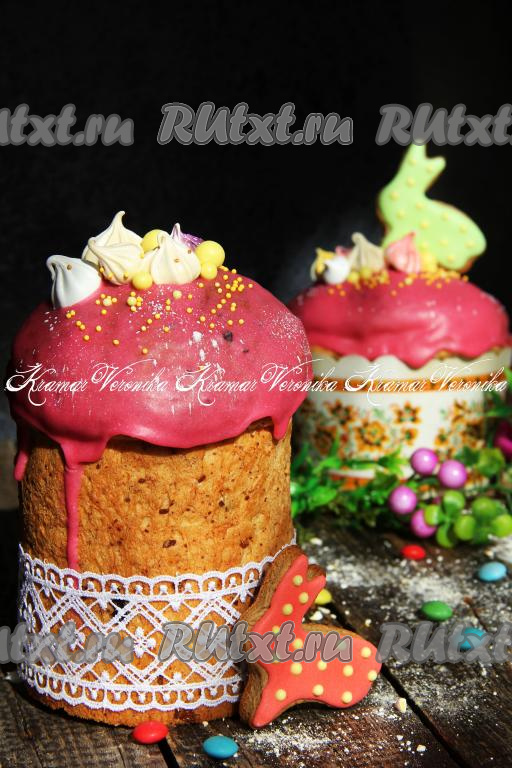 Вкусные творожные куличи покрыть любой глазурью (у меня - ягодная глазурь) и украсить по желанию. Посмотрите, какие красивые куличи получились.