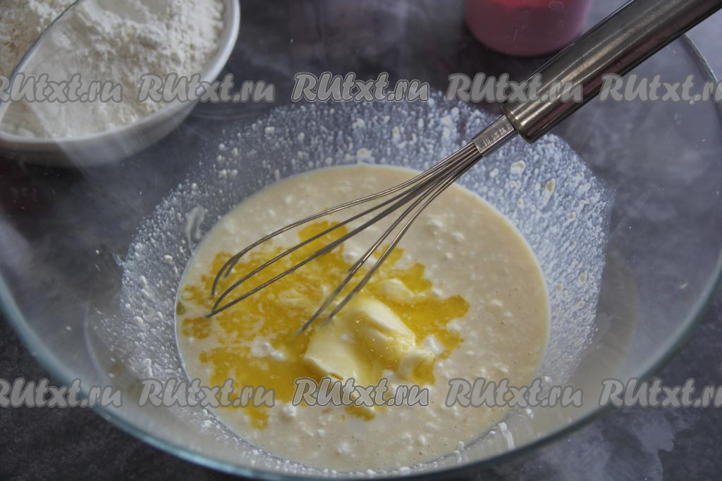 Растопить сливочное масло до жидкого состояния (можно это сделать в микроволновку). Дать маслу остыть до 40 градусов. Влить растопленное масло в миску, вмешать его венчиком.
