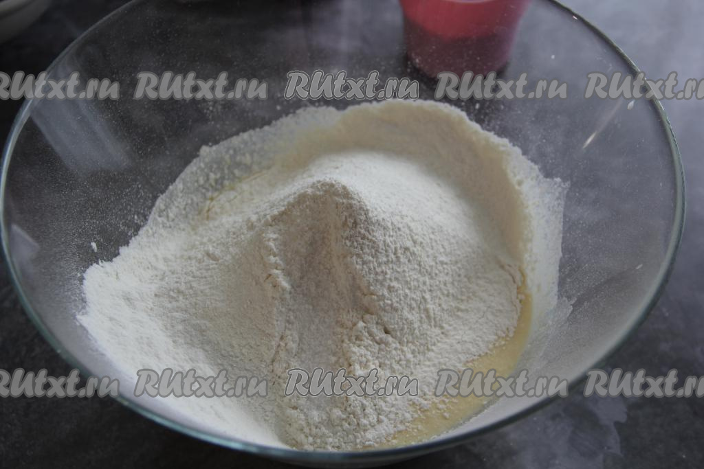 Частями в получившуюся массу всыпать просеянную муку, замешивая творожное тесто для кулича сначала ложкой, а затем - руками.