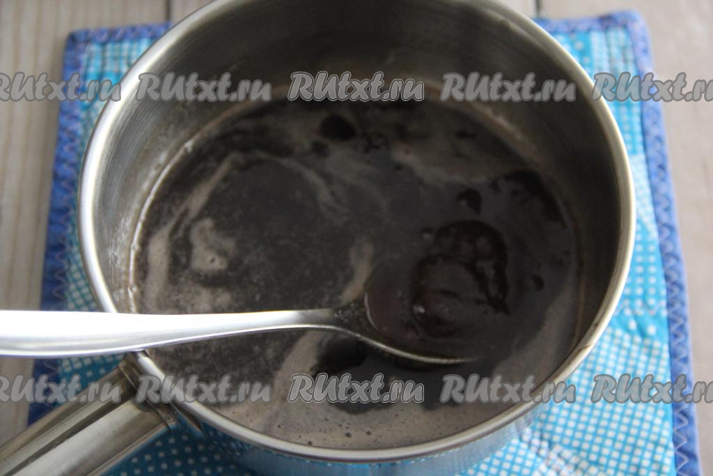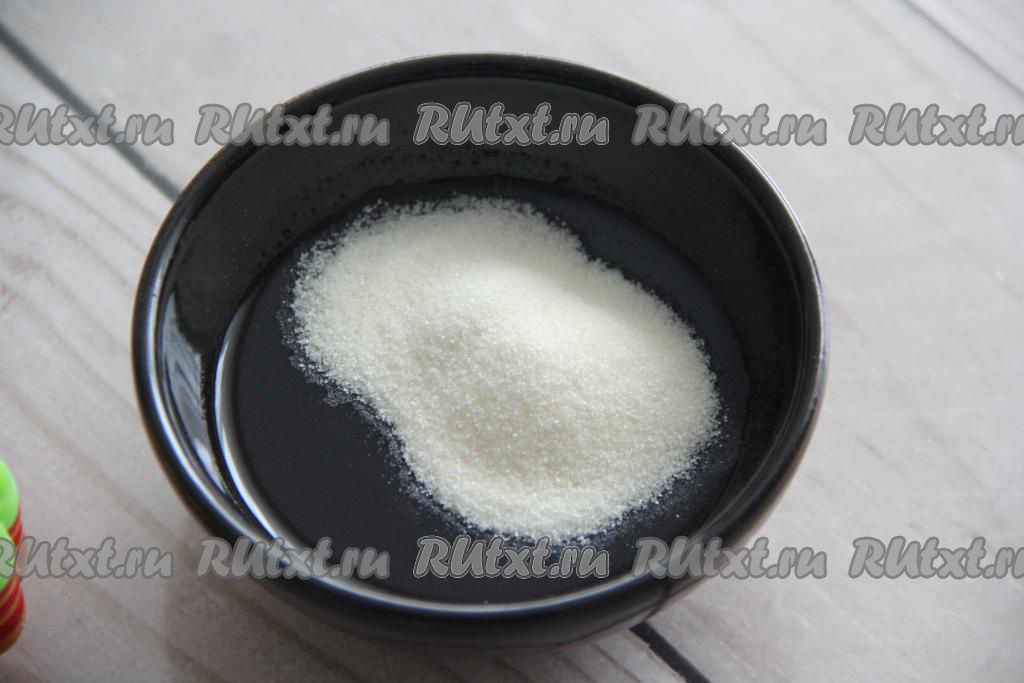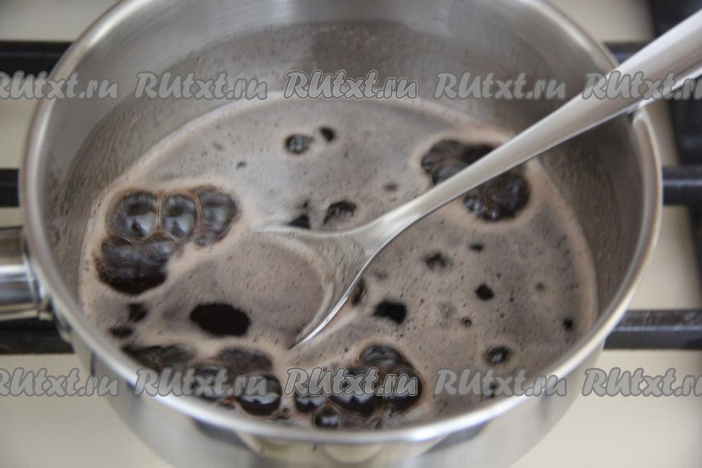 Процедить 200 миллилитров компота (ягоды нам не понадобятся). 150 миллилитров процеженного компота влить в сотейник, добавить 100 грамм сахара. У меня компот не очень сладкий. Количество сахара можно регулировать в зависимости от сладости компота. В очень сладкий компот сахар можно и вовсе не добавлять. Поставить сотейник на огонь.