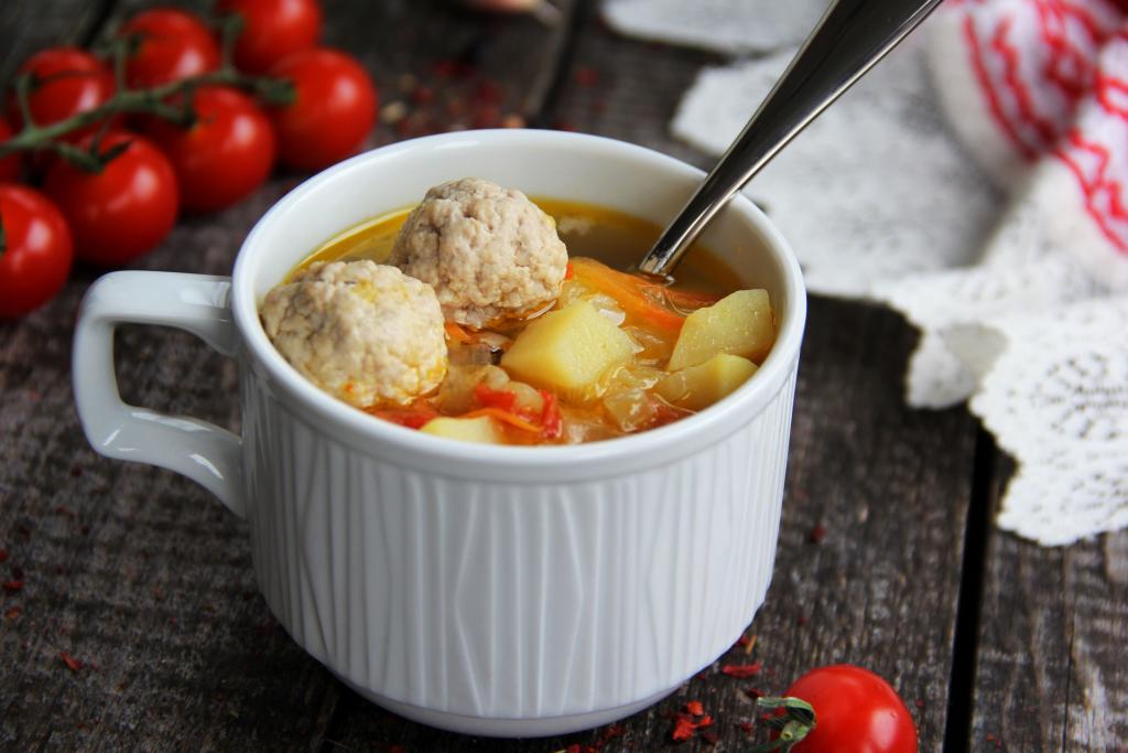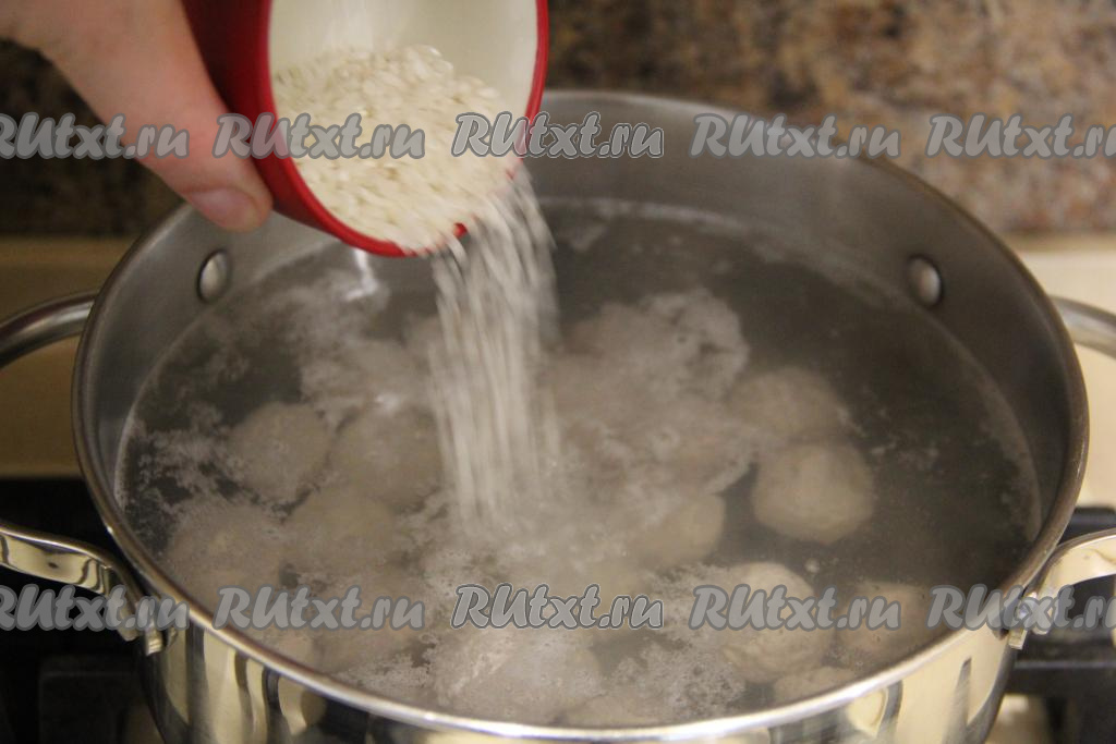 Довести бульон с фрикадельками до кипения и всыпать промытый рис, снова дать закипеть, а затем варить суп минут 15 на небольшом огне.