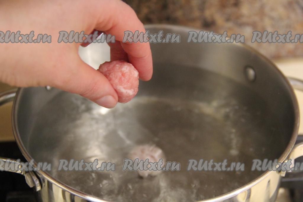 Когда фрикадельки сформированы, можно приступать к приготовлению супа. В кастрюлю нужно влить 1,5 литра воды, поставить на сильный огонь. После того как вода закипит, опустить в неё фрикадельки. Рис хорошо промыть.