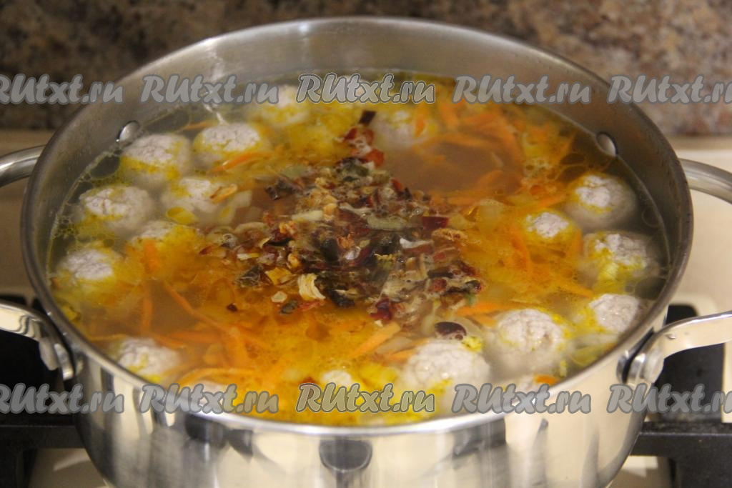 После того как суп с фрикадельками и рисом проварится 15 минут, добавить обжаренные лук с морковкой, посолить по вкусу, всыпать любимые специи (я положила сушёные овощи). Дать закипеть и варить на небольшом огне минут 7. Затем огонь выключить и оставить суп минут на 10-15 настояться под крышкой.