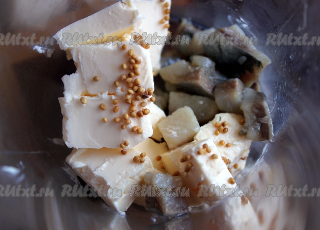 Соединить кусочки селёдки со сливочным маслом и зернами горчицы в стакане блендера.
