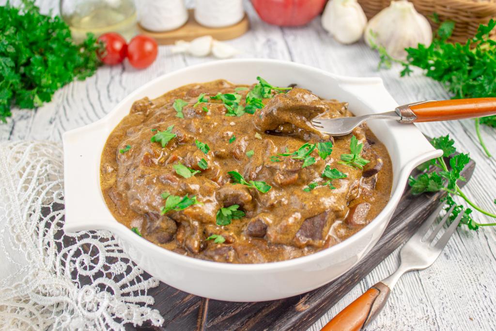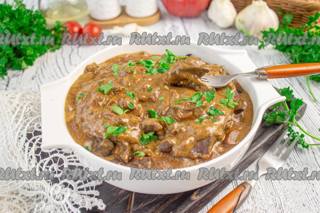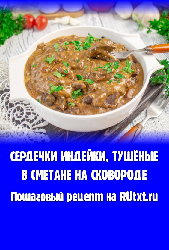 Мягкие, вкусные сердечки индейки, тушёные в сметане на сковороде, подавайте к столу в горячем виде.
