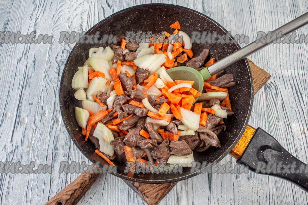 Добавьте морковку с луком к сердечкам в сковороду и готовьте вместе 6-7 минут (до мягкости овощей), иногда помешивая, на среднем огне.