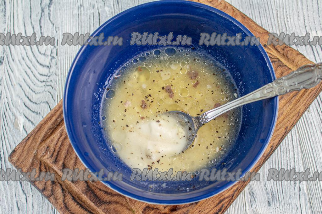 Когда блюдо будет почти готово, возьмите 100-150 мл воды или бульона из сковороды (бульон немного остудите). Смешайте воду или остывший бульон с мукой, солью и чёрным молотым перцем.