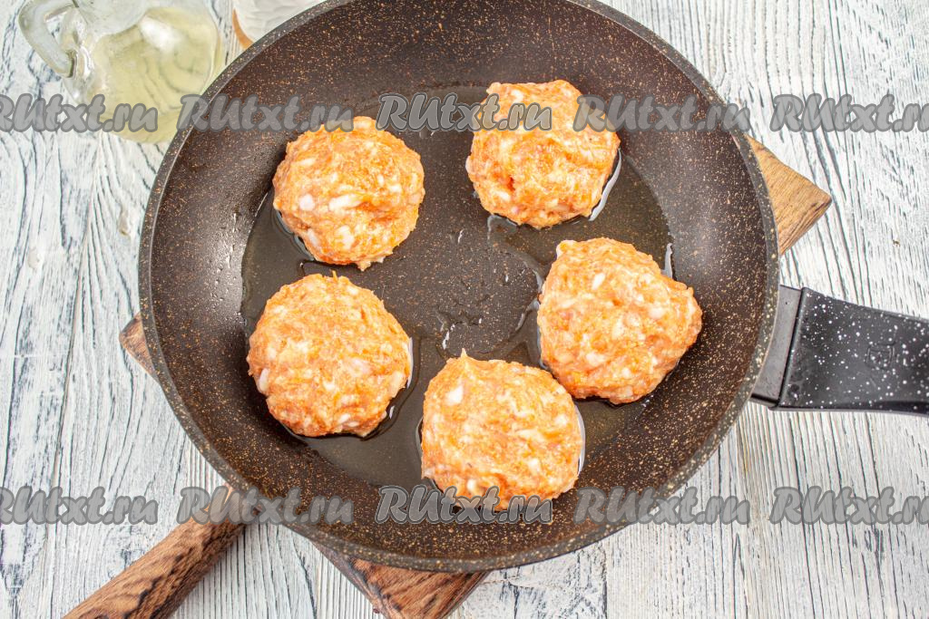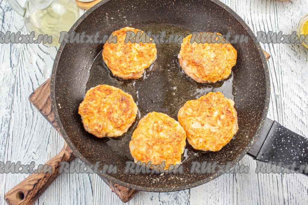 По истечении времени сформируйте из фарша котлеты и выложите их в сковороду, уже разогретую с растительным маслом. Огонь сделайте чуть ниже среднего. Жарьте котлетки с одной стороны 3-4 минуты (до румяности), не накрывая крышкой.