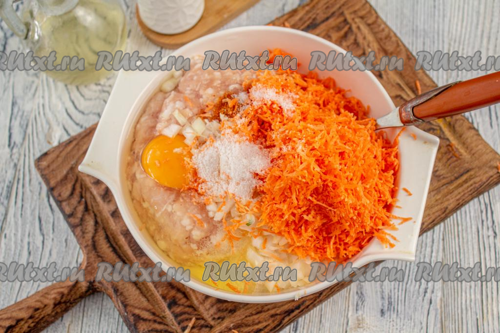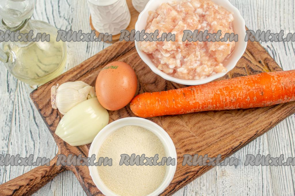 Лук и чеснок очистите и мелко нарежьте. Очистите и натрите на мелкой тёрке морковку. Добавьте подготовленные лук, чеснок и морковку к фаршу, поперчите, посолите по вкусу. Тщательно перемешайте получившийся куриный фарш и оставьте минут на 10-15 (в течение этого времени манка немного набухнет).