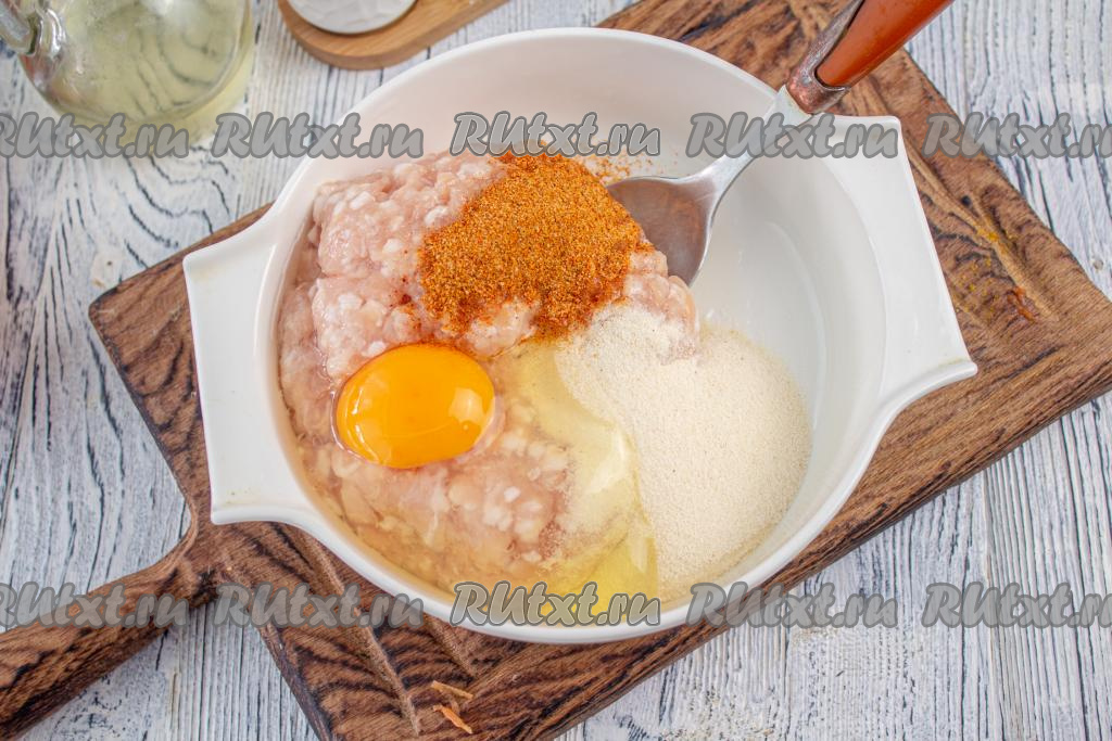 В миску выложите куриный фарш, добавьте универсальную приправу и манную крупу. Вбейте сырое куриное яйцо.