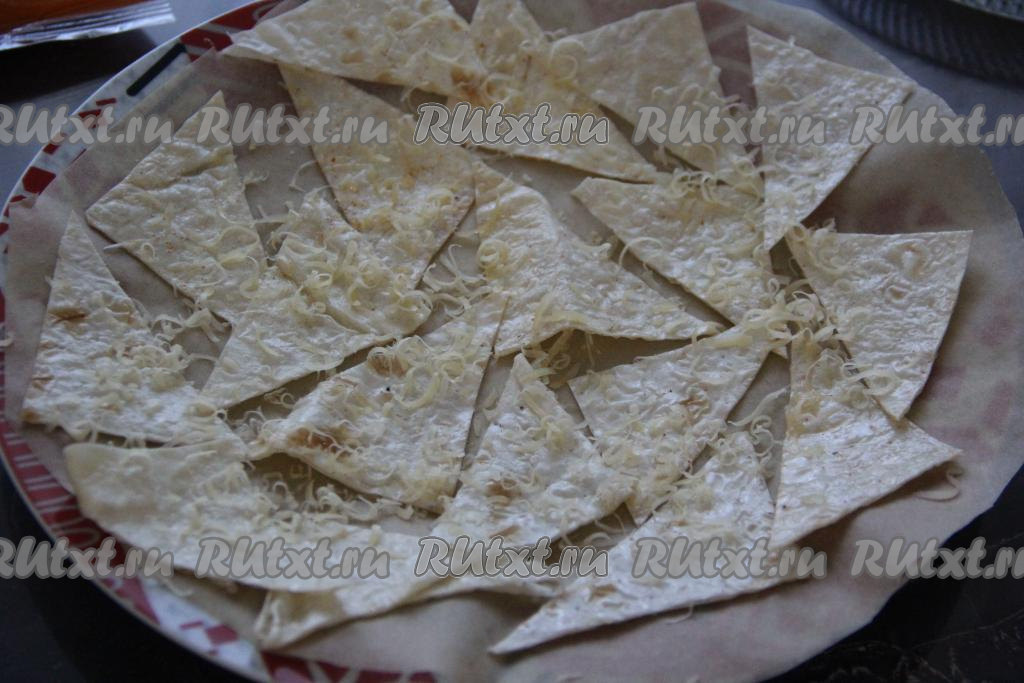 Сверху кусочки лаваша присыпать сыром, натёртым на мелкой тёрке. Поставить тарелку в микроволновку.