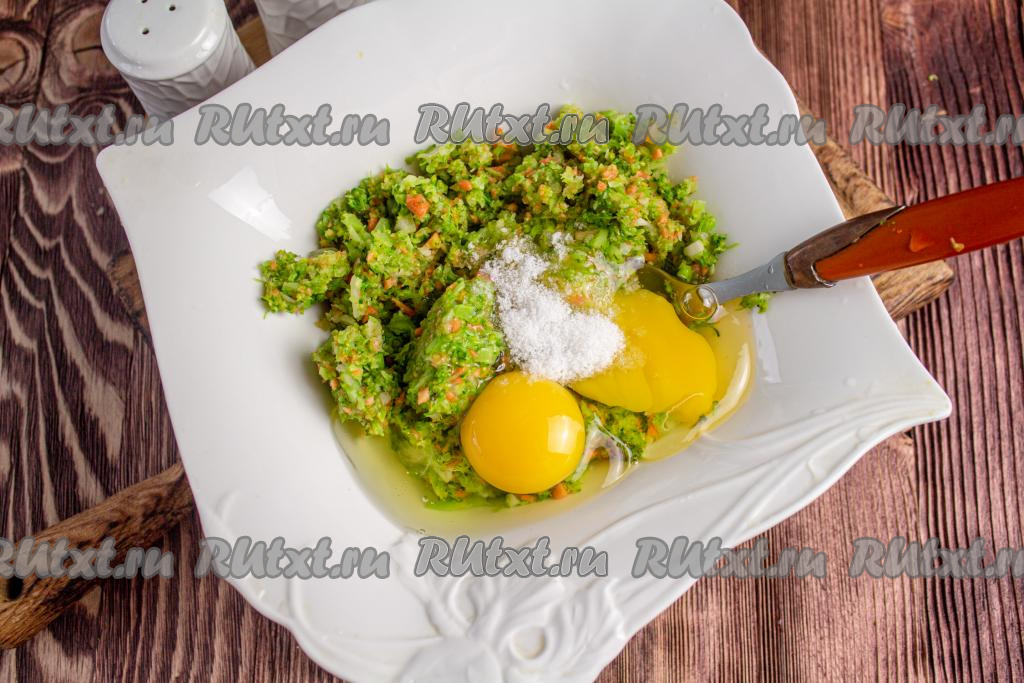 К овощному пюре добавьте соль, чёрный молотый перец по вкусу и вбейте сырые куриные яйца, перемешайте.