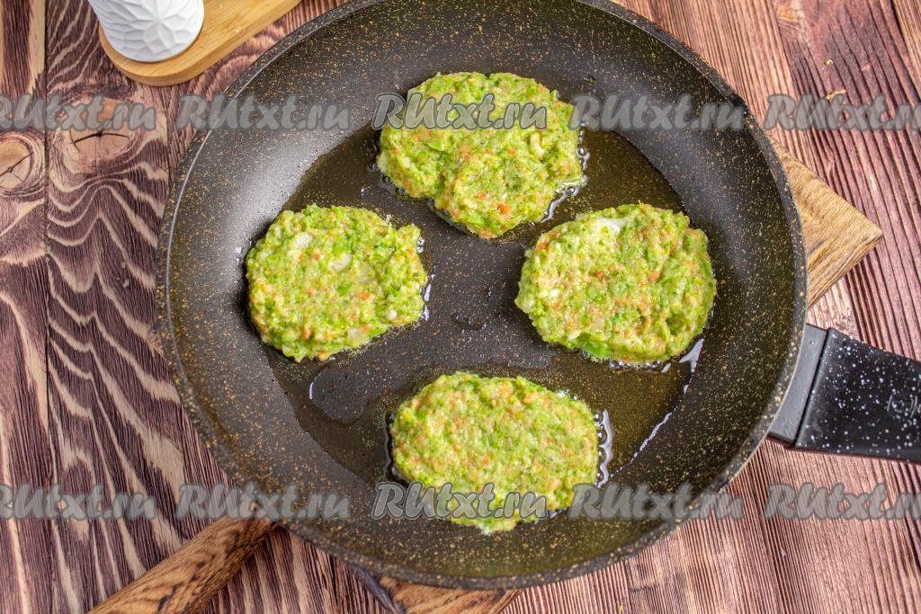 Сковороду хорошо нагрейте, влейте растительное масло, при помощи столовой ложки выложите овощную массу, приплюсните слегка, чтобы получились оладьи. Жарьте оладьи из брокколи при слабом нагреве под крышкой 5 минут (до подрумянивания) с одной стороны.