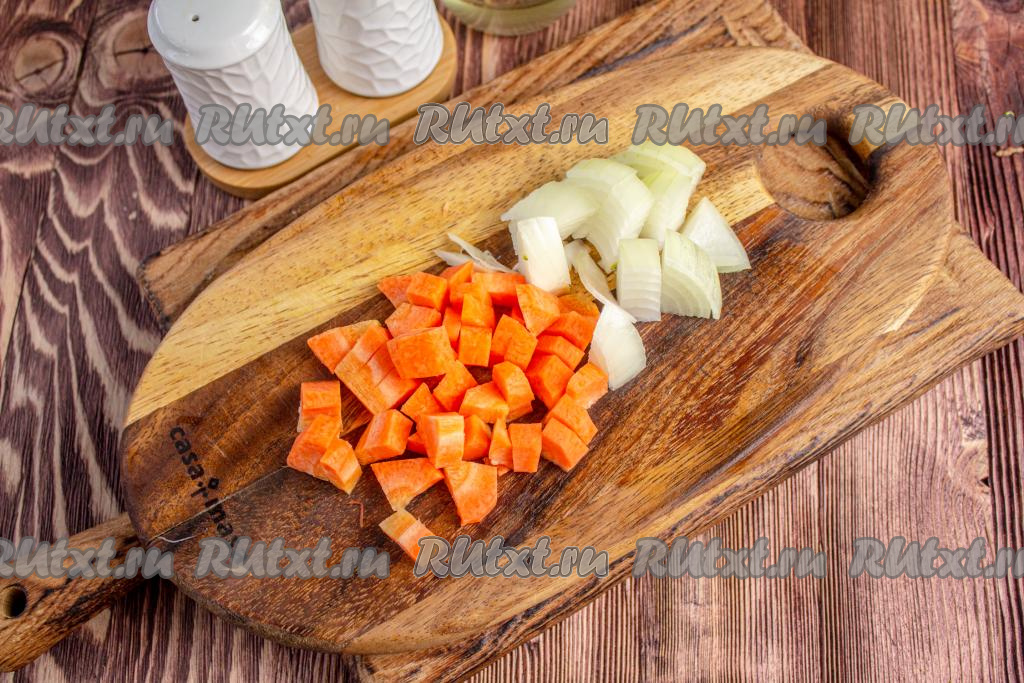 Лук, морковь и чеснок очистите и нарежьте на небольшие кусочки.