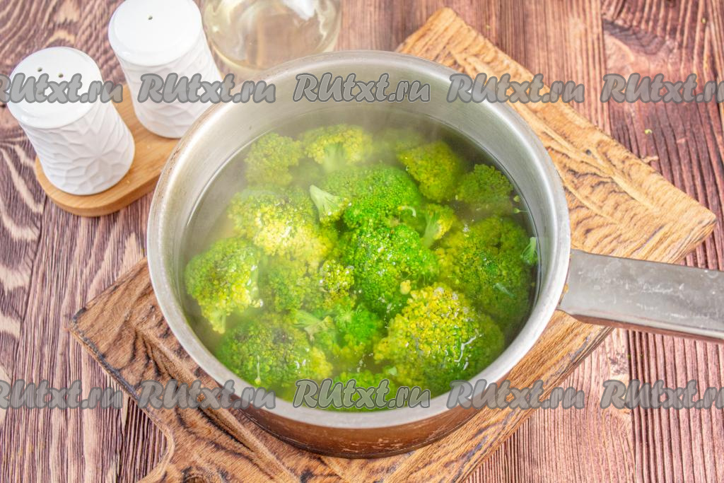 В ковшике (или небольшой кастрюльке) доведите до кипения 1-1,5 литра воды, слегка присолите, выложите брокколи и готовьте 2-3 минуты. Затем откиньте соцветия капусты на сито и промойте под холодной водой. Оставьте, чтобы стекла вся жидкость. Я использовала свежую капусту брокколи, если у вас замороженная, то разморозьте её полностью, откиньте на сито, чтобы стекла лишняя влага. Варить замороженную капусту не надо.