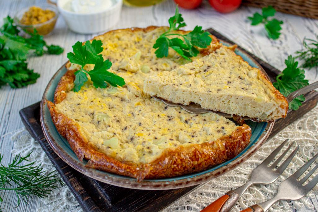 При помощи лопатки переложите вкусный, нежнейший омлет с цветной капустой из чаши мультиварки на блюдо и подавайте на завтрак или на ужин.