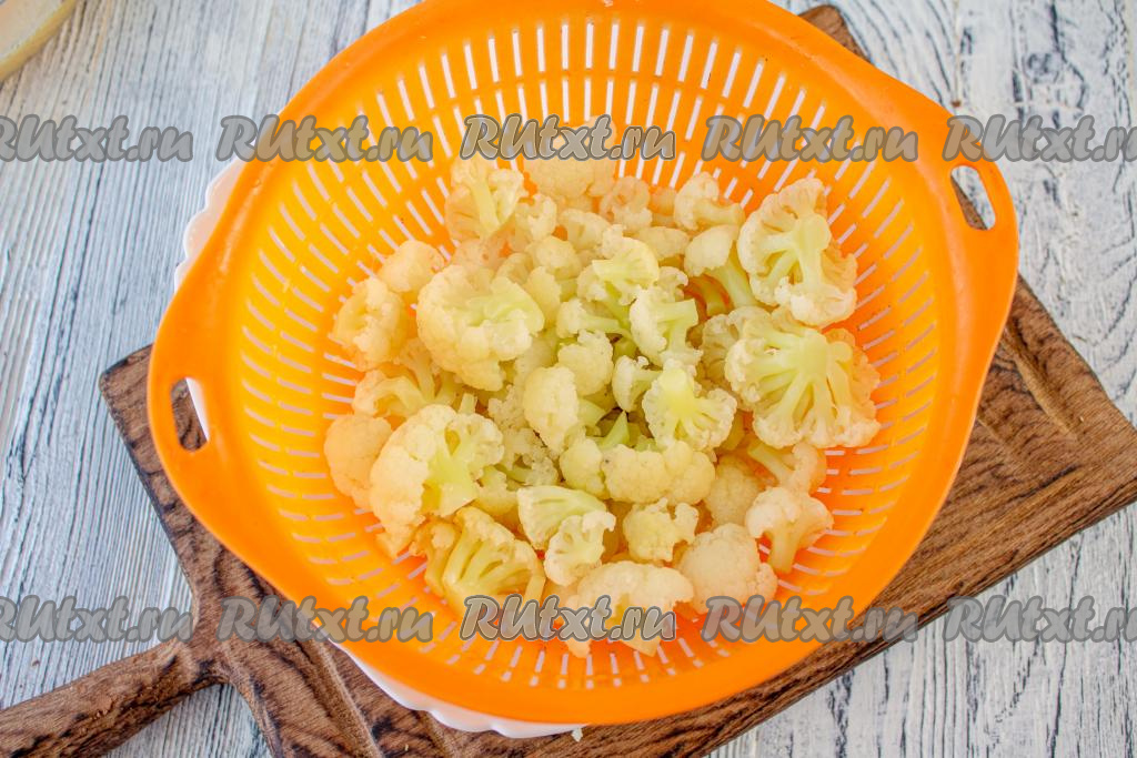 Свежую цветную капусту промойте, а затем разберите её на небольшие соцветия. Если готовите с замороженной капустой, тогда просто достаньте её из морозилки.