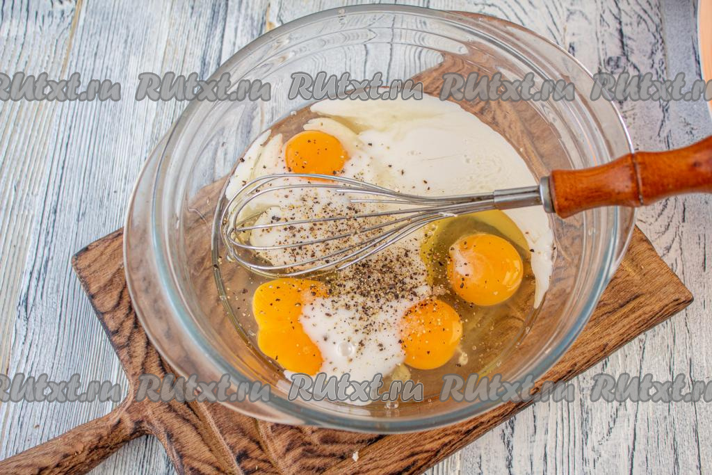 Вбейте в миску куриные яйца, влейте молоко, посолите, поперчите и тщательно перемешайте яично-молочную смесь венчиком.