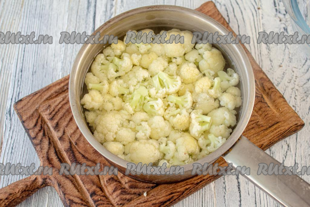 В сотейнике (или небольшой кастрюльке) вскипятите воду, подсолите и выложите соцветия свежей (или замороженной) цветной капусты, отварите с момента закипания на небольшом огне в течение 4-5 минут.