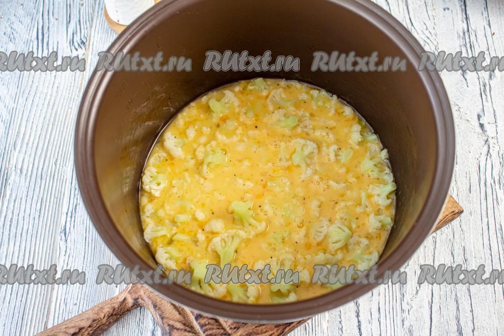 На цветную капусту вылейте яично-молочную смесь, крышку мультиварки закройте. Установите на 30 минут программу "Выпечка" и готовьте омлет до сигнала.