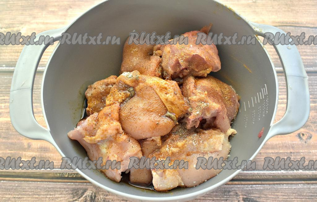 Если используете для этого блюда целую курицу, тогда разрубите её на порционные кусочки. Я взяла бёдра. По желанию, с бёдер снимаем кожу. Разрезаем на 2 или 3 части каждое бёдрышко. Ополаскиваем кусочки мяса водой, обсушиваем их и перекладываем в миску. Вливаем соевый соус, лимонный сок. Чуть-чуть солим (ведь соевый соус уже достаточно солёный), всыпаем приправу для курицы. Перемешиваем и оставляем мясо мариноваться на 15-20 минут.