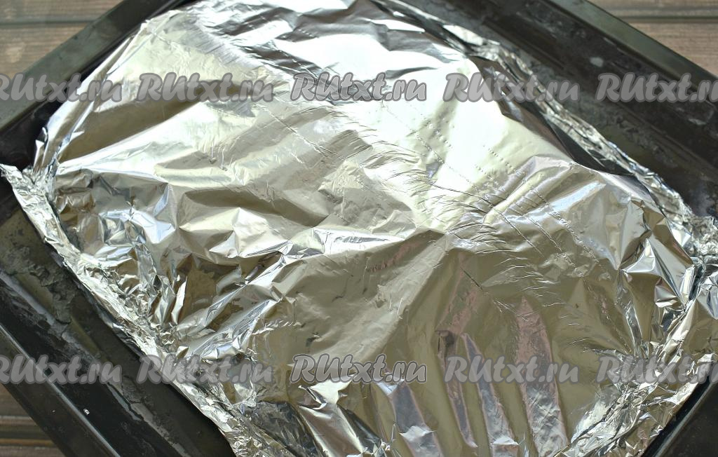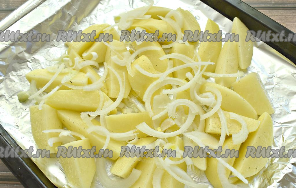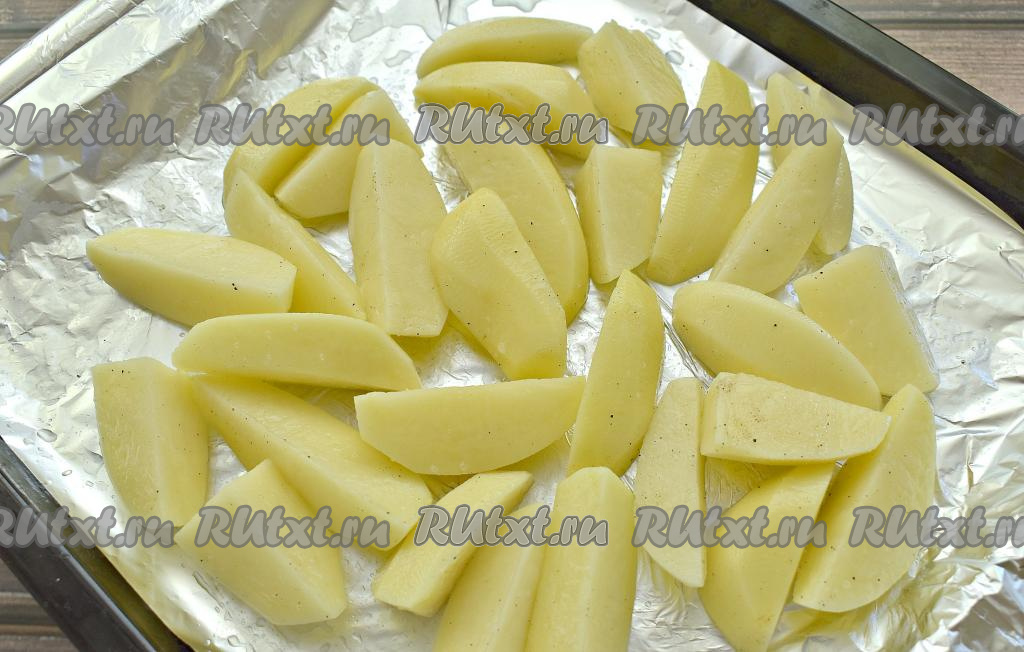Противень застилаем куском фольги с «запасом». Выкладываем картошку в один слой.
