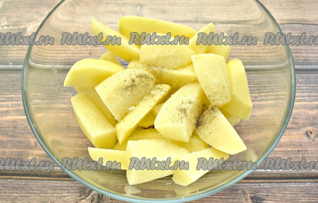 Очищаем картофель, нарезаем на крупные ломтики, по вкусу солим и перчим, перемешиваем.