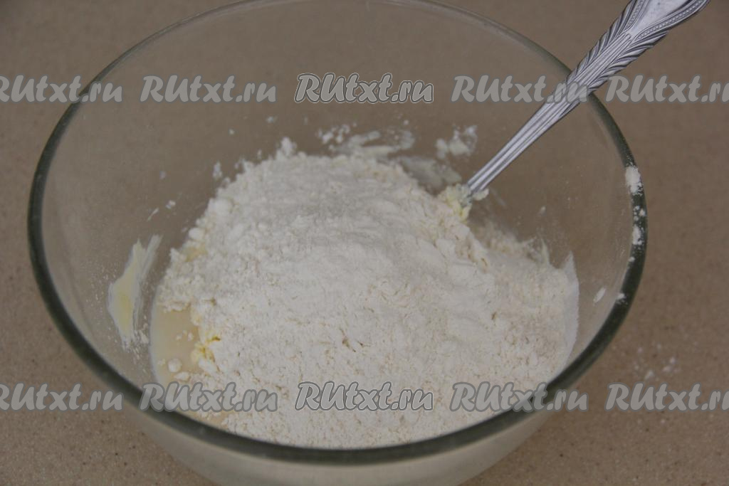 Влить молоко и хорошо перемешать. Затем в получившуюся массу частями всыпать муку, каждый раз перемешивая тесто до однородного состояния.