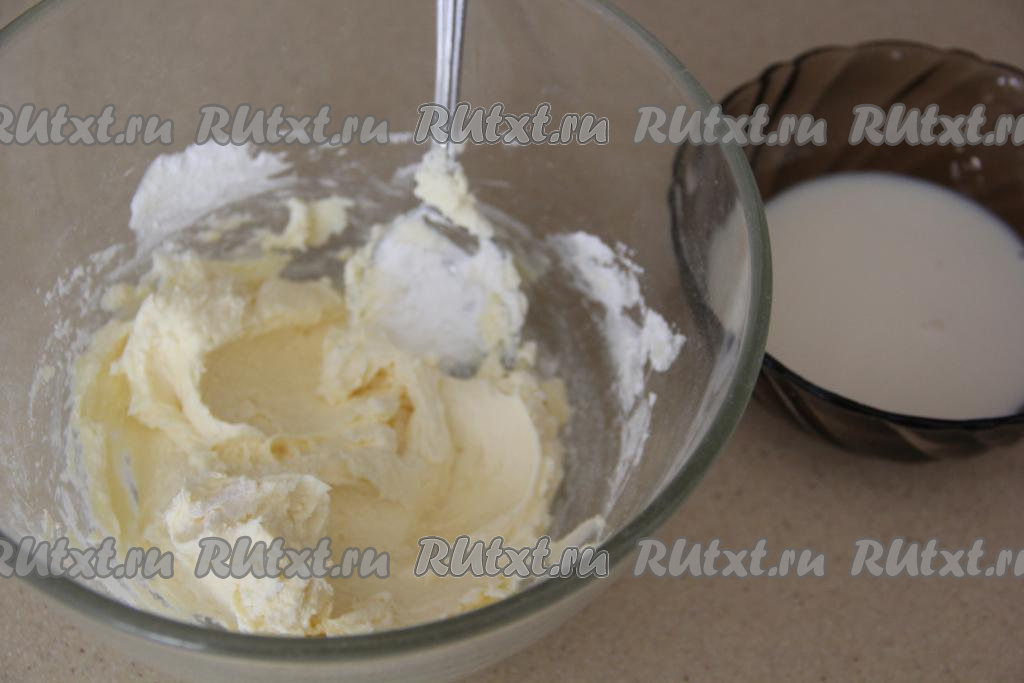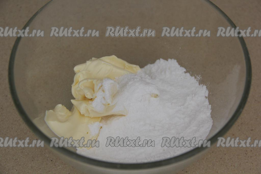 Заранее достать сливочное масло из холодильника, чтобы оно размягчилось при комнатной температуре. Соединить мягкое масло и сахарную пудру (заменять сахарную пудру на сахар не рекомендую, так как кристаллики сахара достаточно крупные, а нам нужно в результате получить нежную текстуру теста).
