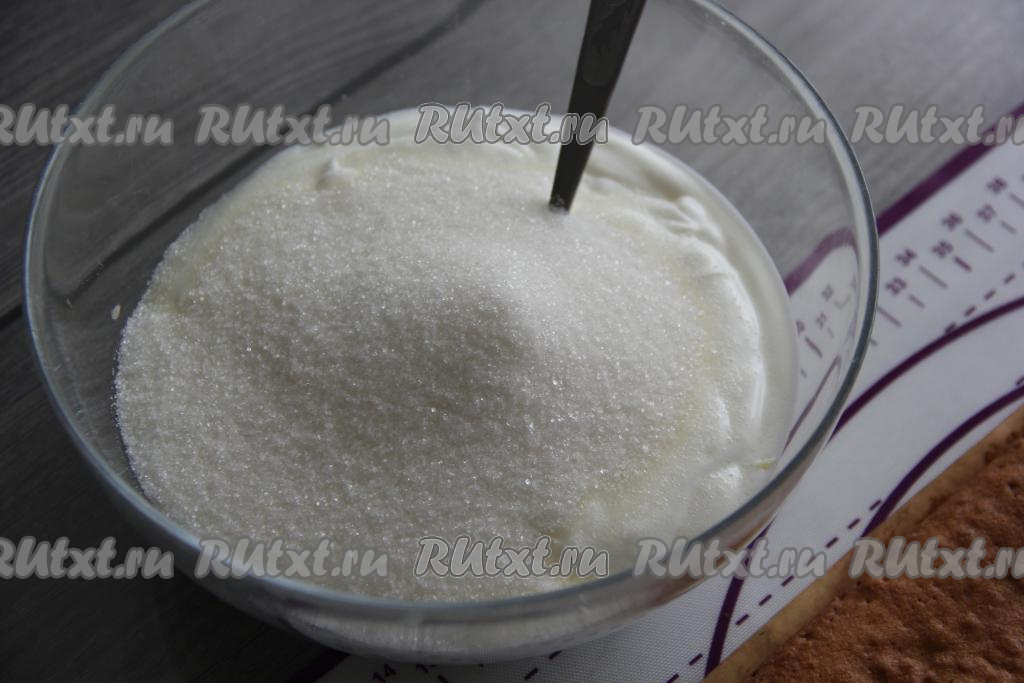 Для приготовления крема соединить в миске сметану и сахар, перемешать ложкой и оставить минут на 15 (до полного растворения сахара).