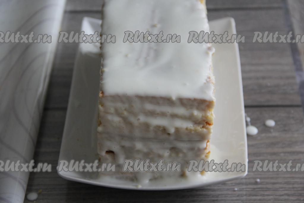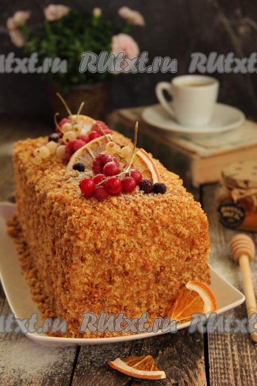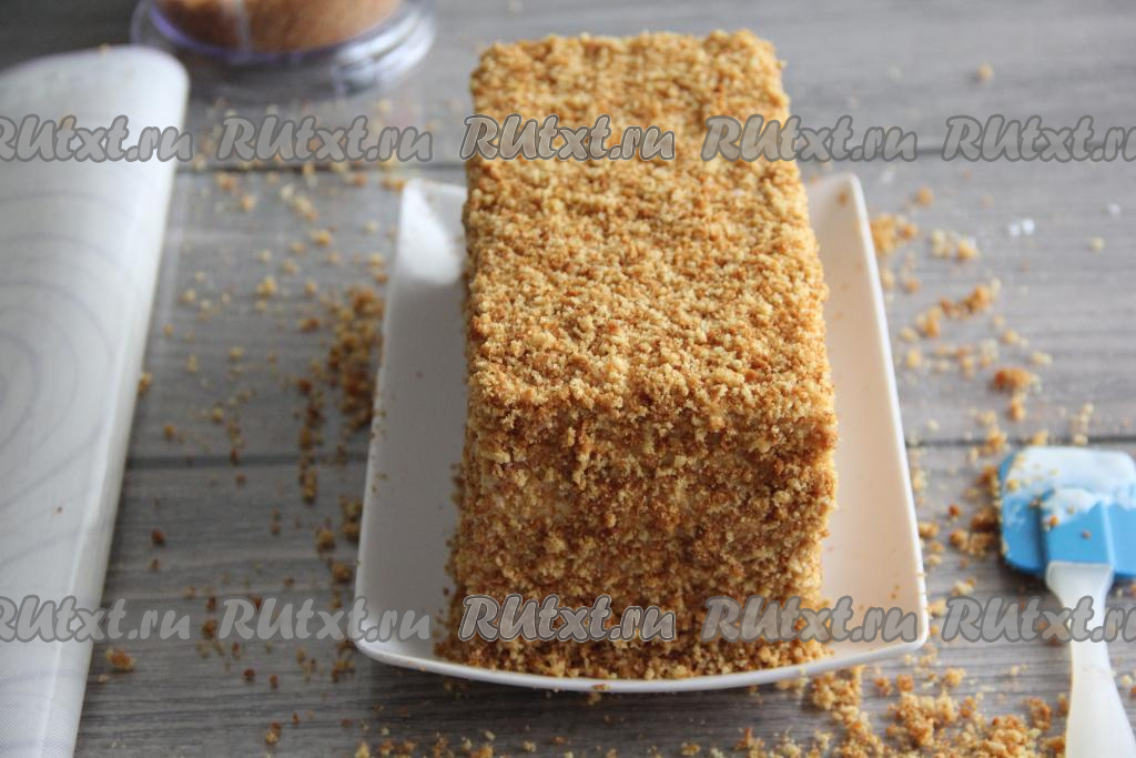Обсыпать ленивый медовик крошкой со всех сторон и поставить в холодильник на ночь.