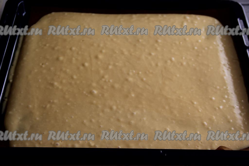 Добавляя муку, ориентируйтесь на консистенцию теста для медовика. Тесто должно получиться не густым (оно будет напоминать тесто для оладий) и очень воздушным. Противень (у меня противень размером 30 на 30 сантиметров) выстелить тефлоновым ковриком (или бумагой для выпечки), выложить тесто и разровнять его лопаткой (или ложкой).