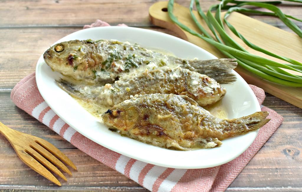 Вкусные, нежные караси, тушёные в сметане, готовы. Сразу подаём их на стол.