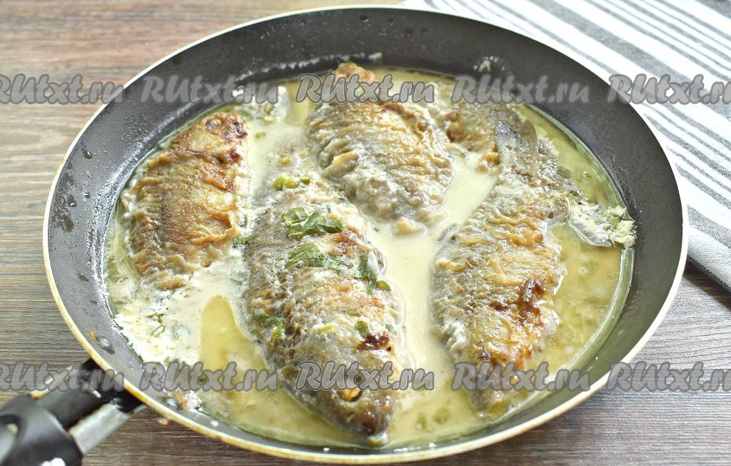 После закипания убавляем огонь до маленького. Сковороду накрываем крышкой. Тушим карасей в сметане 10 минут.