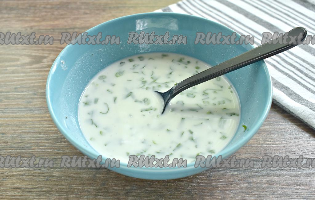 Пока жарится рыбка, приготовим заливку из сметаны. Для этого в миску выкладываем сметану, вливаем к ней тёплую кипячёную воду, немного солим, перчим, добавляем нарезанную зелень, перемешиваем.