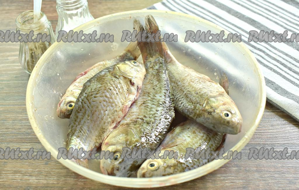 Каждого карасика натираем солью и перцем снаружи и внутри. По желанию, можно добавить приправу для рыбы, но я обхожусь без неё. Карасей минут на 5 оставляем мариноваться в специях.