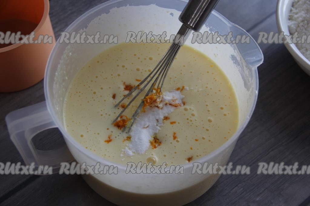 Перемешать яично-творожную массу венчиком. Для того чтобы выпечка получилась более ароматной, можно добавить ванилин и цедру апельсина, перемешать.