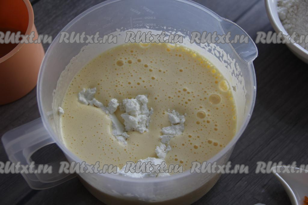 Добавить в яичную массу творог. Я предварительно пробила творог погружным блендером для более нежной консистенции.