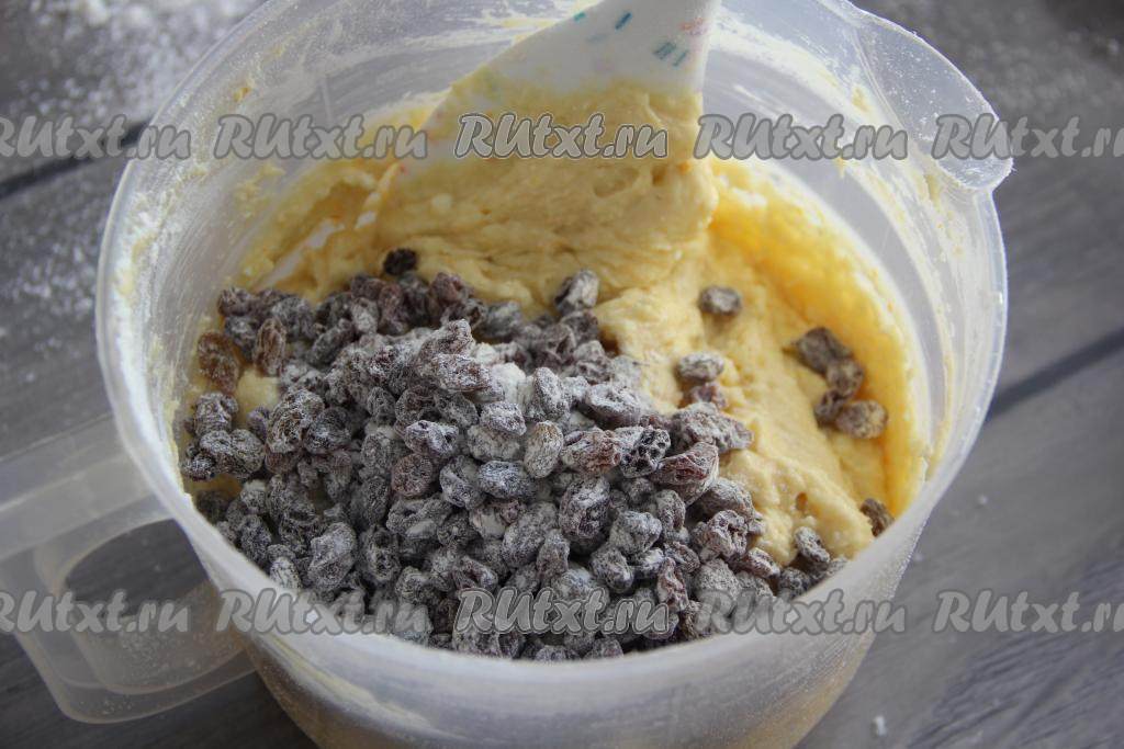Изюм отдельно смешать с 1 столовой ложкой муки, а затем добавить в тесто и хорошо перемешать лопаткой.