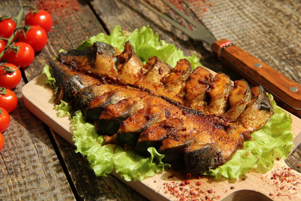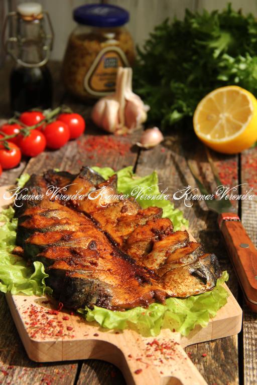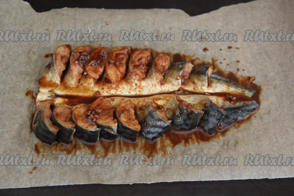 Смазать скумбрию маринадом и поставить в разогретую духовку.