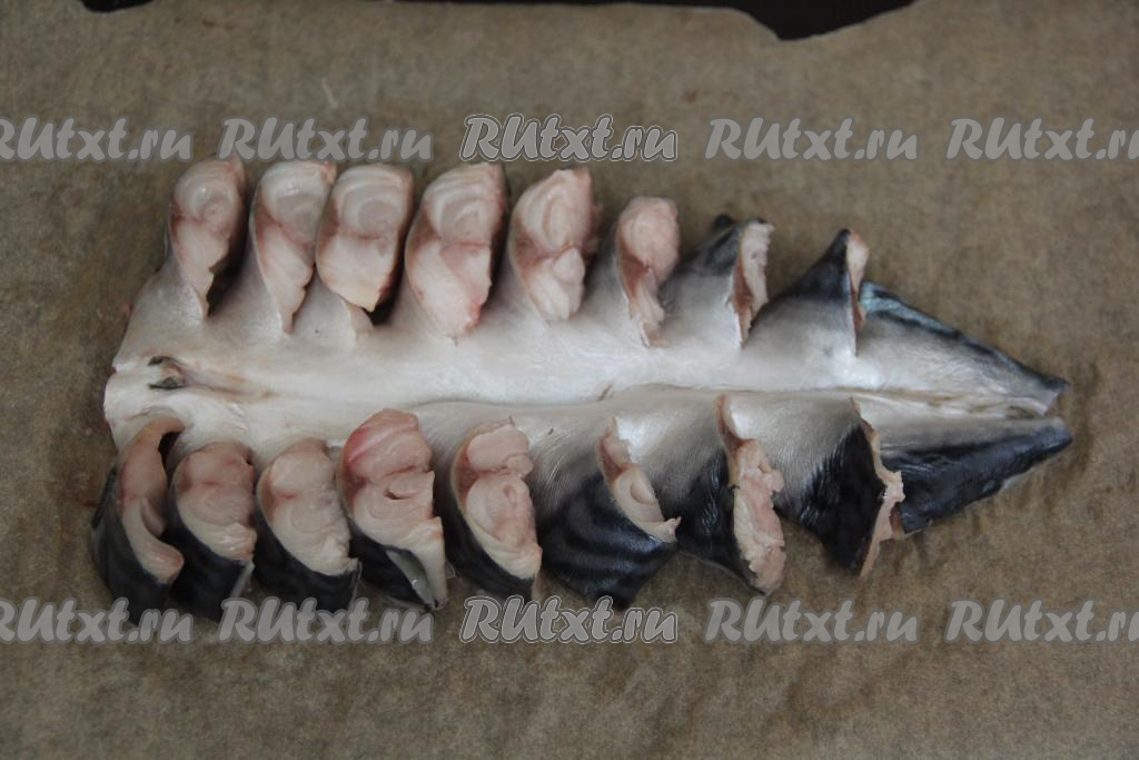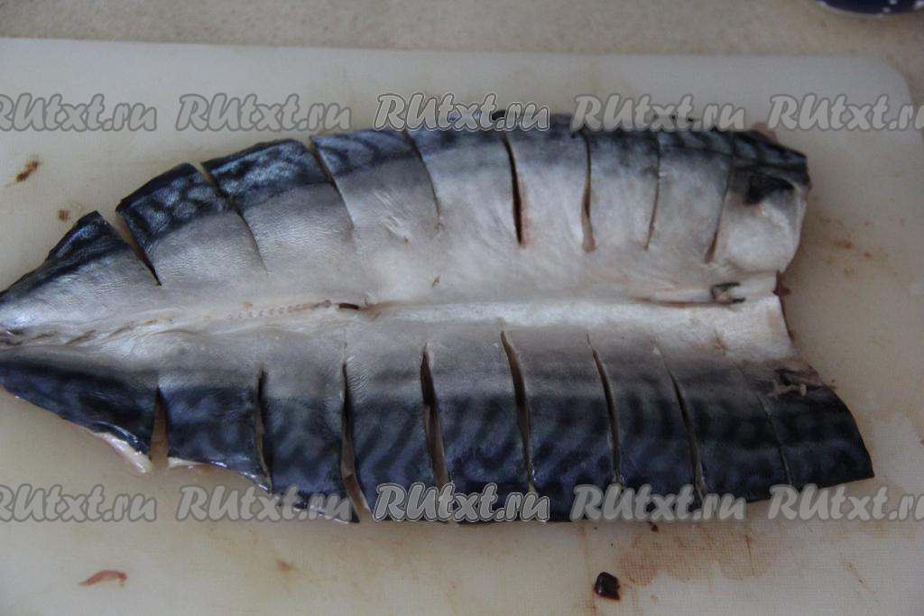Скумбрию промыть водой, разрезать по хребту со стороны спины (то есть разрезаем не как обычно со стороны брюшка, а именно со стороны спинки). Достать внутренности и основную кость. Удалить мелкие косточки. Сделать по двум сторонам филе разрезы шириной, примерно, 2 сантиметра (как на фото).