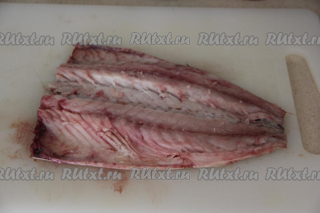 Скумбрию промыть под водой, удалить голову, хвост и внутренности. Разрезать скумбрию по брюшку, удалить основную кость и мелкие косточки, ещё раз промыть. Получившееся филе скумбрии обсушить бумажным полотенцем.